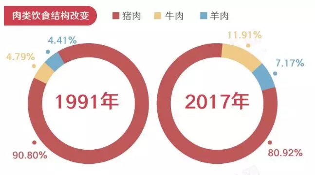 然而,近年來,中國消費者對豬肉的熱情似乎在減退。根據(jù)新華網(wǎng)最新發(fā)布的數(shù)據(jù)顯示,在由豬、牛、羊三類構(gòu)成的肉類市場中,豬肉的消費量占比已經(jīng)從1991年的90.8%下降到2017年的80.9%。而且,這一數(shù)據(jù)還將繼續(xù)下降。此消彼長之下,牛肉的消費量有了不少的提升。
