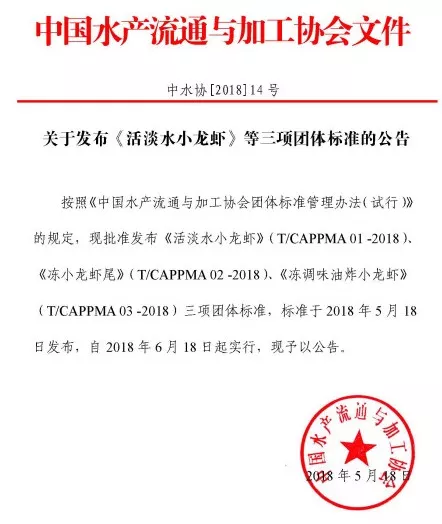 5月18日,經(jīng)中國水產(chǎn)流通與加工協(xié)會批準(zhǔn),由中國小龍蝦協(xié)會及協(xié)會成員單位共同起草、編制的《活淡水小龍蝦》(T/CAPPMA 01 -2018)、《凍小龍蝦尾》(T/CAPPMA 02 -2018)、《凍調(diào)味油炸小龍蝦》(T/CAPPMA 03 -2018)三項團(tuán)體標(biāo)準(zhǔn)正式發(fā)布。