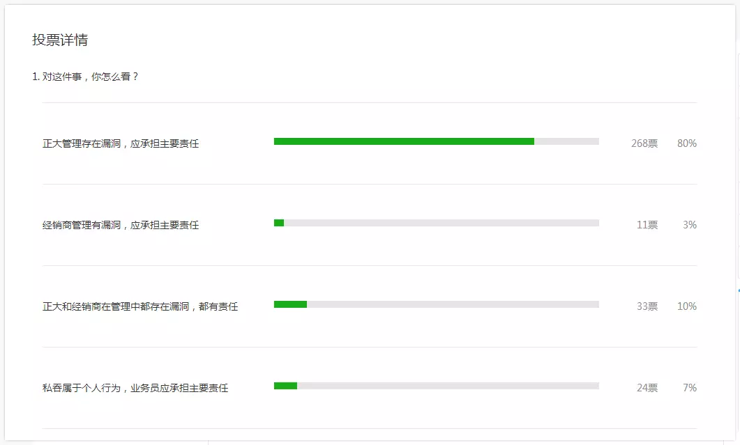 微信公眾號“凍品商”對此事件所做的一項調(diào)查顯示:參與投票的人中,認(rèn)為“南通正大管理存在漏洞,應(yīng)承擔(dān)主要責(zé)任”占投票總?cè)藬?shù)的80%;認(rèn)為“南通正大和經(jīng)銷商在管理中都存在漏洞,都有責(zé)任”的占10%,居第二位;認(rèn)為“私吞屬于個人行為,業(yè)務(wù)員應(yīng)承擔(dān)主要責(zé)任”的占7%;認(rèn)為“經(jīng)銷商管理有漏洞,應(yīng)承擔(dān)主要責(zé)任”占比僅為3%。