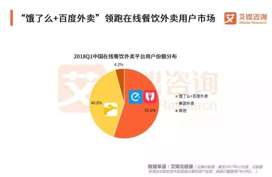 iiMedia Research(艾媒咨詢)數(shù)據(jù)顯示,在2018年第一季度,餓了么與百度外賣仍占優(yōu)勢,市場用戶份額占比達55.0%,美團外賣占比40.8%緊隨其后,市場格局兩家獨大。