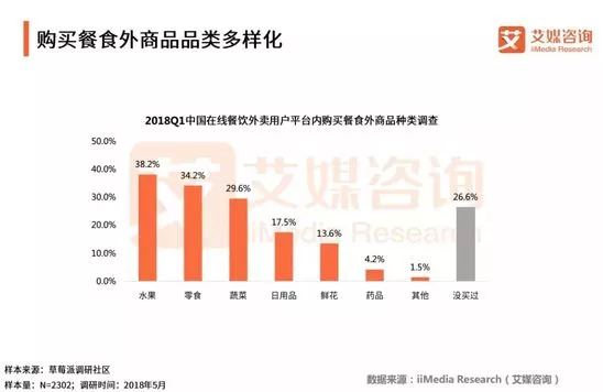 數(shù)據(jù)顯示,只有26.6%的受訪在線外賣用戶沒有在在線餐飲外賣平臺購買過餐食外商品,大部分用戶均在平臺內(nèi)購買過餐食外商品。其中,以水果、零食、蔬菜等與平臺業(yè)務(wù)相關(guān)性較高的食品購買比例靠前,而鮮花、藥品、日用品等商品的購買率較低。