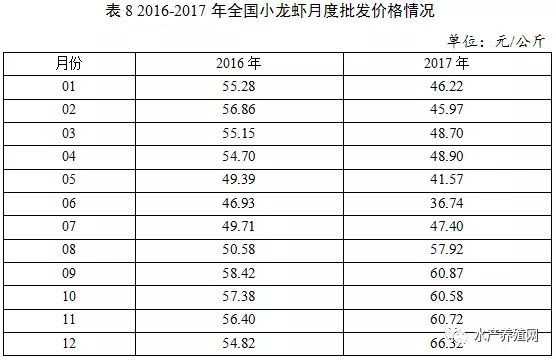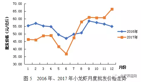據(jù)對(duì)全國水產(chǎn)品批發(fā)市場價(jià)格監(jiān)測數(shù)據(jù)分析,2017年3-4月份小龍蝦批發(fā)市場價(jià)格較高,一般為45-55元/公斤,5月下旬至6月底價(jià)格短期回落,低位運(yùn)行在35-45元/公斤,7月上旬開始回升并一路走高,達(dá)60-70元/公斤。