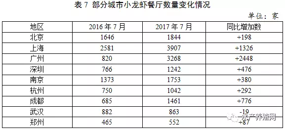 近年來,各地積極加大小龍蝦菜肴開發(fā),形成了一大批小龍蝦知名菜肴和餐飲品牌,如江蘇盱眙的“十三香龍蝦”、南京的“金陵鮮韻”系列、湖南南縣的“冰鎮(zhèn)湯料蝦”、湖北潛江的“油燜大蝦”等,有效推動(dòng)了小龍蝦餐飲消費(fèi)向深度發(fā)展。據(jù)美團(tuán)點(diǎn)評(píng)網(wǎng)統(tǒng)計(jì),2017年7月,除武漢市小龍蝦餐廳數(shù)量較2016年同期有小幅下降外,北上廣深等城市都呈現(xiàn)出快速上漲趨勢,其中廣州市、上海市同比分別增加了2448家和1326家。大量商家涌入小龍蝦餐飲市場,除從事小龍蝦專營店外,還紛紛做起小龍蝦兼營,如必勝客、肯德基分別推出了小龍蝦披薩、小龍蝦帕尼尼等產(chǎn)品。