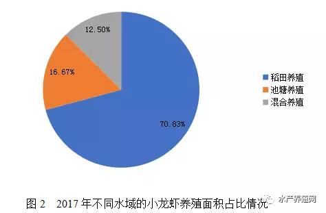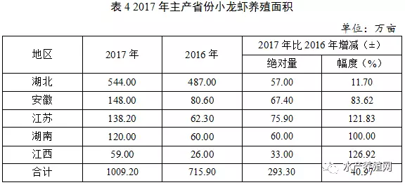 據(jù)不完全統(tǒng)計(jì),2017年全國小龍蝦養(yǎng)殖面積達(dá)1200萬畝,較2016年增加300萬畝。按養(yǎng)殖水域分,2017年全國小龍蝦稻田養(yǎng)殖面積約為850萬畝,占總養(yǎng)殖面積的70.83%,池塘養(yǎng)殖面積約為200萬畝,占總養(yǎng)殖面積的16.67%,其他蝦蟹混養(yǎng)、大水面增殖、蓮(葦)田套養(yǎng)等混養(yǎng)面積約為150萬畝,占總養(yǎng)殖面積的12.50%。2017年全國小龍蝦稻田養(yǎng)殖面積約占全國稻田養(yǎng)魚面積2524萬畝的47.54%,較2016年增加了7.54個(gè)百分點(diǎn)。