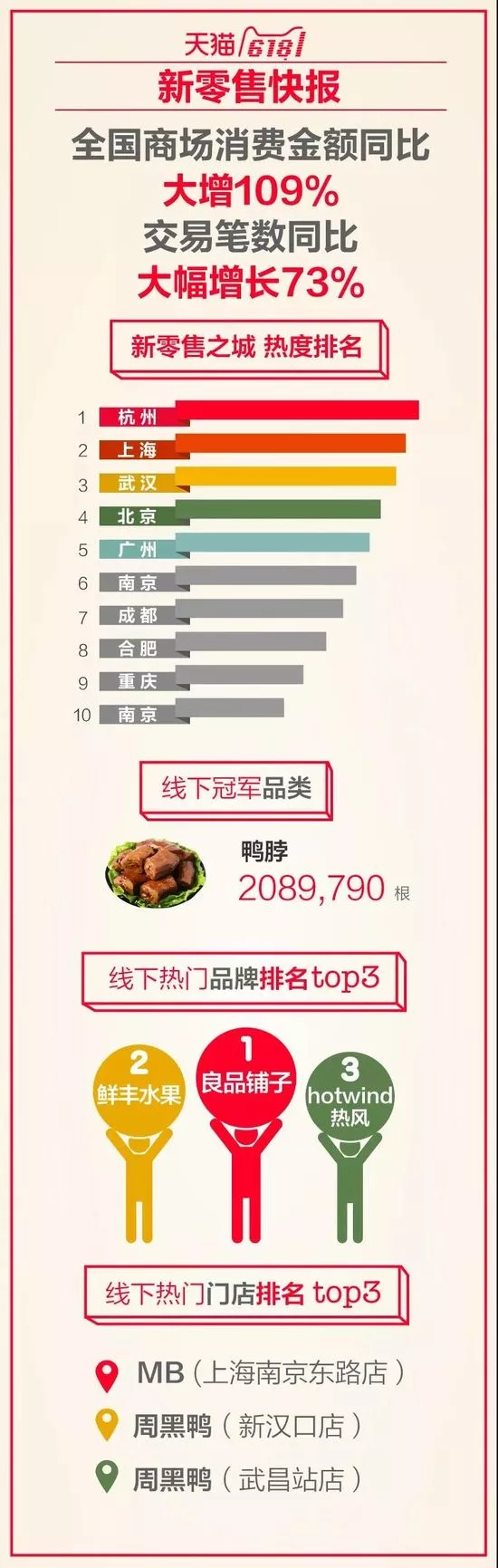 天貓新零售數(shù)據(jù)顯示,在全國(guó)10萬(wàn)家天貓智慧門(mén)店中,線下交易熱度城市排名分別為杭州、上海、武漢、北京、廣州、南京、成都、合肥、重慶、南京。