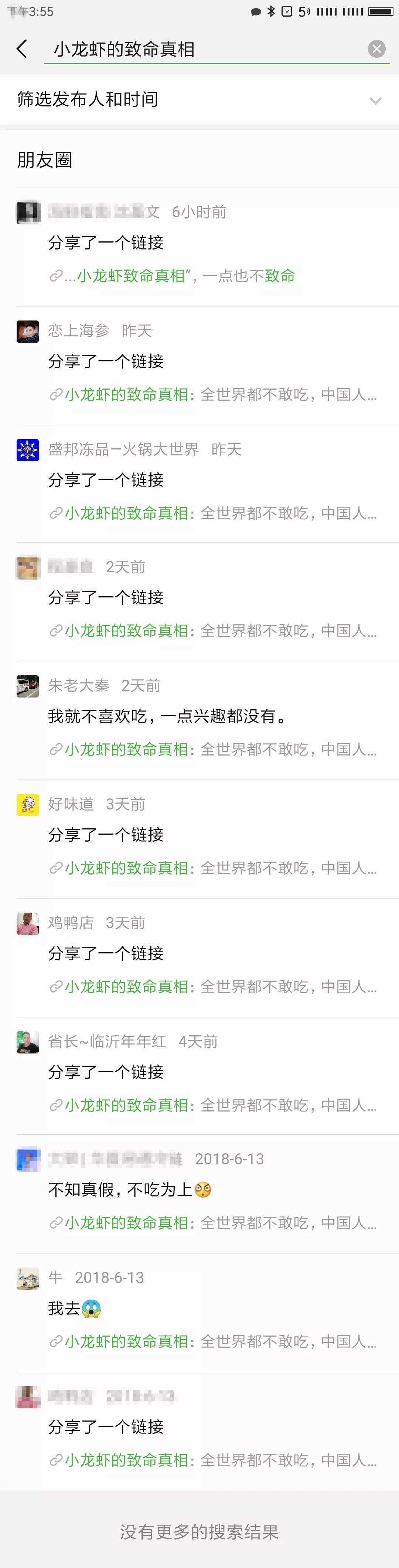 最近在朋友圈有一篇很熱的網(wǎng)文在到處流傳,題目叫做《小龍蝦的致命真相:你可能永遠不知道》,這篇文章被眾多的公號來回轉(zhuǎn)載,已經(jīng)很難找到原出處在哪里,但傳播確實很廣,隨便在朋友圈里搜一下,就是這個結(jié)果。