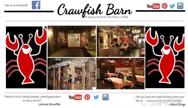 美國南方的路易斯安娜州人民也是小龍蝦愛好者,而且絕對不是網(wǎng)文中說的“小龍蝦已經(jīng)從他們的餐桌上逐漸消失”,路易斯安娜不少以小龍蝦作為招牌菜的餐館現(xiàn)在生意都紅火著呢, 像“小龍蝦大倉”(Crawfish Barn)這樣的店甚至還有自己的專屬網(wǎng)站,誰說不吃小龍蝦,餐館老板第一個拎起炒勺跟他急信不信?