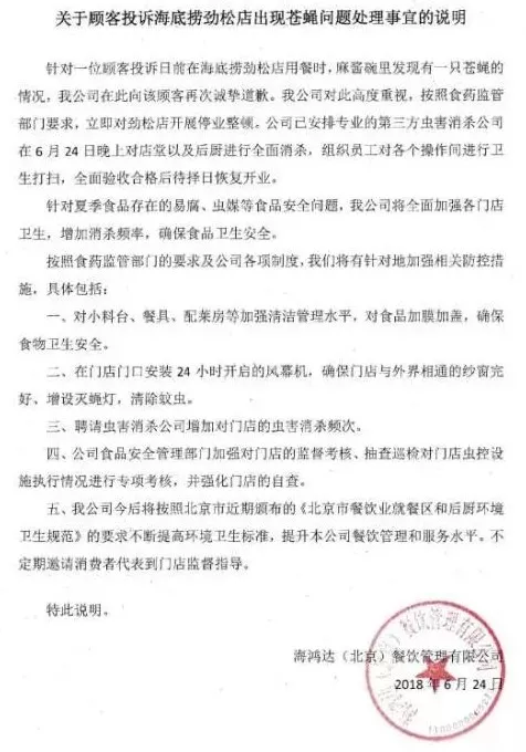 對于此次事件,海底撈在聲明中還表示將增加對門店的蟲害消殺頻次,加強(qiáng)對門店的監(jiān)督考核、抽查巡檢對門店蟲控設(shè)施執(zhí)行情況進(jìn)行專項考核,并提升公司管理和服務(wù)水平。