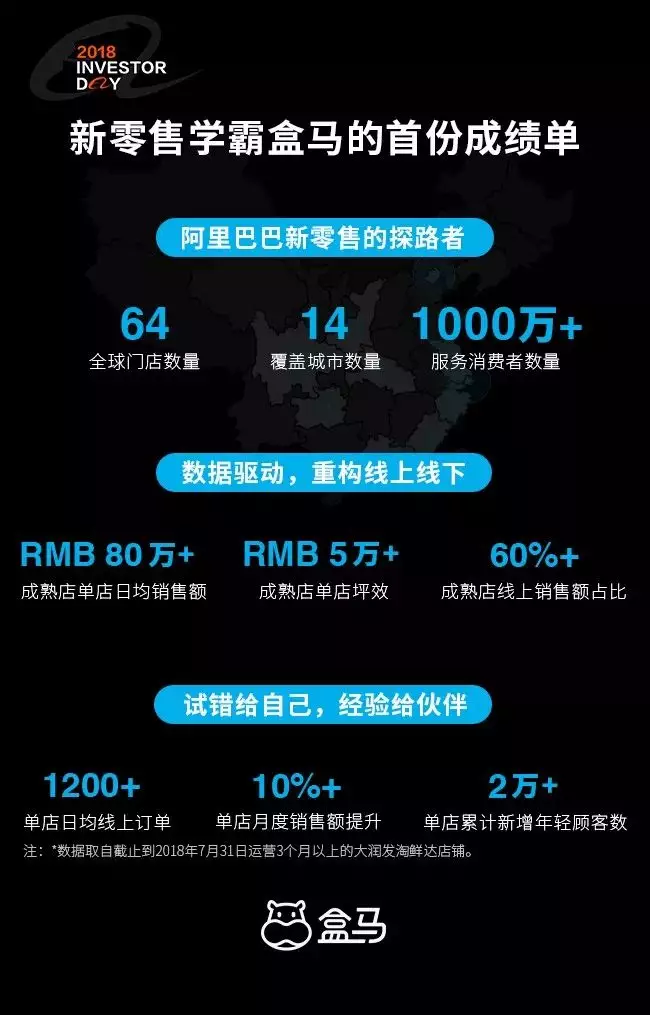 盒馬的首份成績單顯示,截至2018年7月31日,盒馬已在全國擁有64家門店,分布在14個城市里,服務(wù)超過1000萬消費(fèi)者。