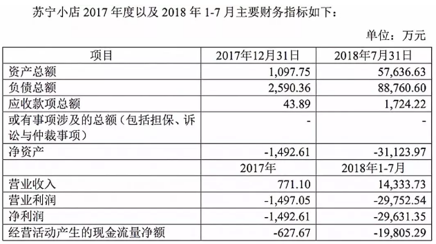 從其公告中披露出的最新業(yè)績來看,該筆增資對蘇寧小店十分重要。數(shù)據(jù)顯示,蘇寧小店2018年1至7月營收1.43億元,虧損2.96億元,債務(wù)高達(dá)6.53億元。股權(quán)轉(zhuǎn)讓的前提,即蘇寧易購清理掉此債務(wù)。此次將蘇寧小店業(yè)務(wù)剝離出上市公司,也是防止未來蘇寧小店擴(kuò)張?jiān)斐傻奶潛p影響到上市公司的業(yè)績。