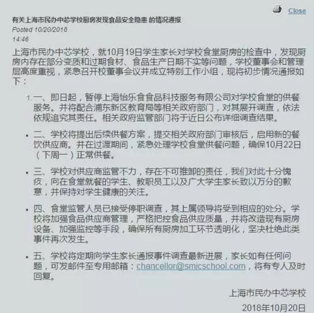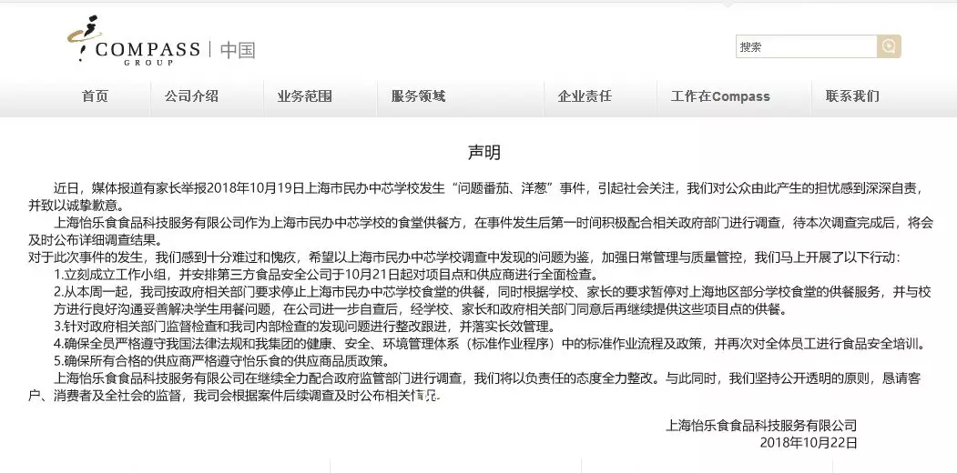 根據(jù)學(xué)校的通報情況,該食堂的供應(yīng)商是上海怡樂食食品科技服務(wù)有限公司,由康帕斯(compass)百分百占股,已經(jīng)為中芯國際學(xué)校服務(wù)四年。