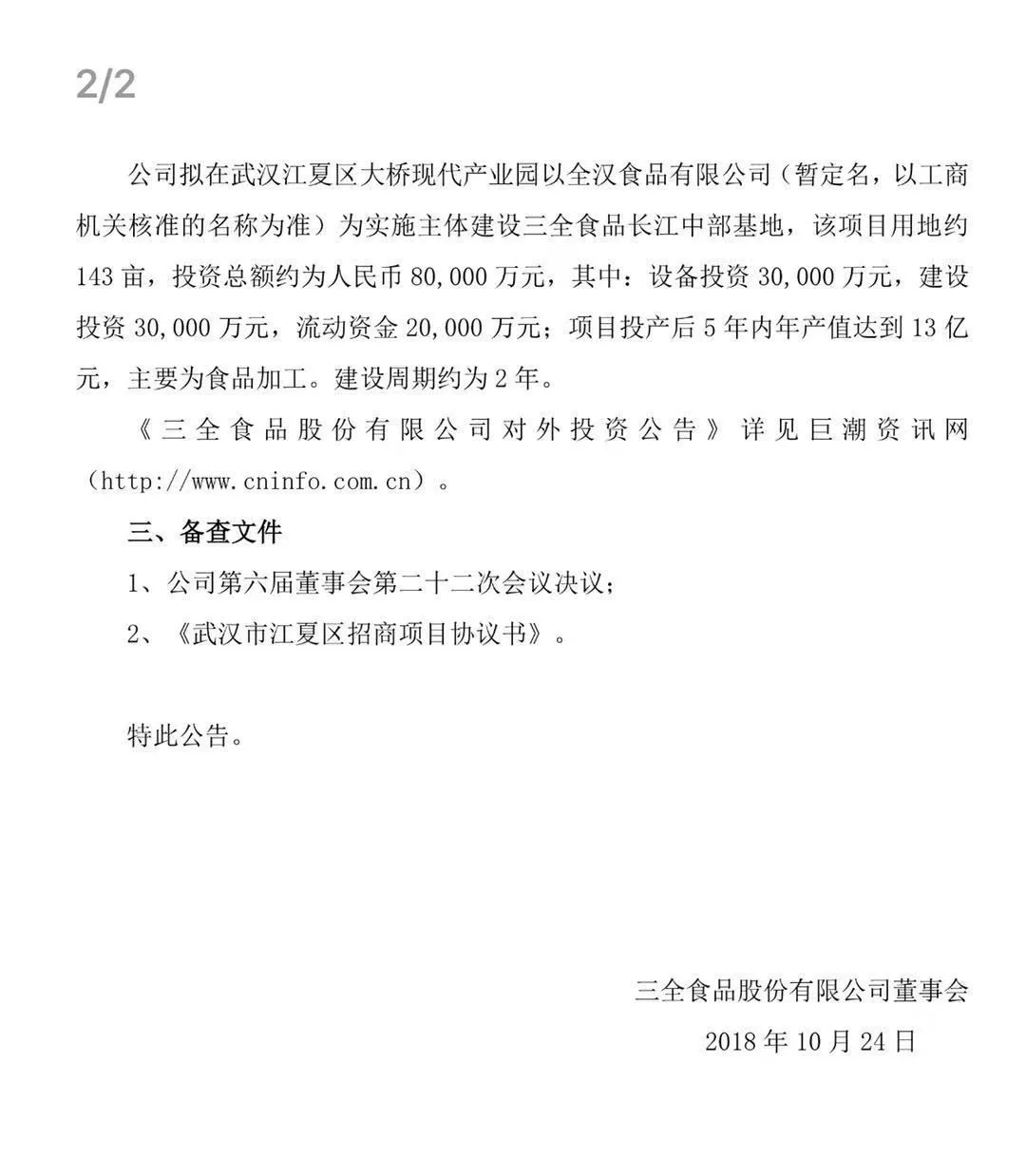 10月17日,安井食品與湯陰縣人民政府簽約,擬投資3億元建華北生產(chǎn)基地。今天,三全食品又發(fā)公告稱,擬投資8億元在武漢建設(shè)長江中部基地。