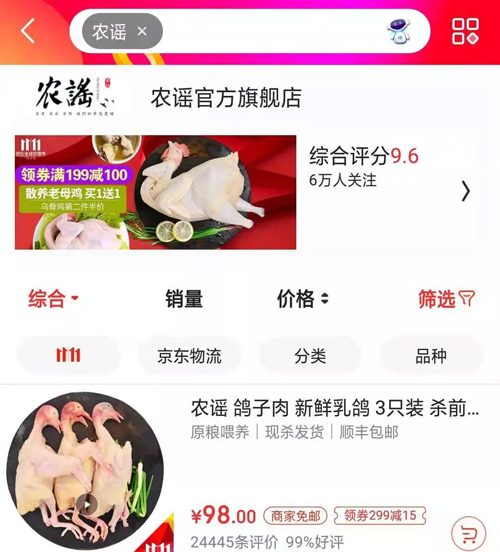 “很多商家習慣把好東西放在線下銷售,因為可以賣上價格,把品質(zhì)較差的產(chǎn)品放在網(wǎng)上賣,去拼價格,我卻堅持要把好東西放在網(wǎng)上賣。”據(jù)悉,農(nóng)謠爆款乳鴿毛利其實很低,也許正是楊勇反其道的“堅持”,其每天發(fā)貨量達到700單。