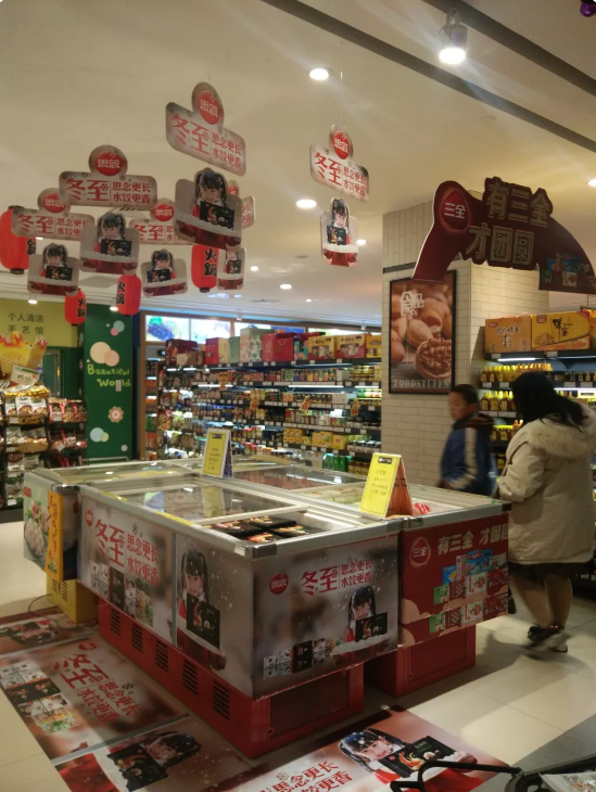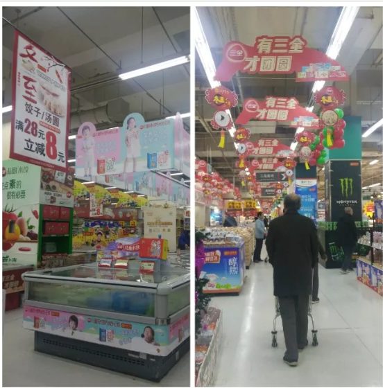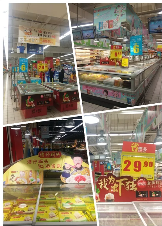 現(xiàn)場:“有三全 才團(tuán)圓”的廣告板烘托出了濃濃的過節(jié)氛圍,而超市開展的湯圓水餃類產(chǎn)品滿28元立減8元的活動(dòng)則給了消費(fèi)者實(shí)實(shí)在在的優(yōu)惠。