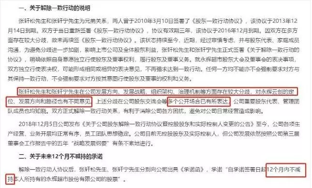 公告表示,張軒松和張軒寧在公司發(fā)展方向、發(fā)展戰(zhàn)略、組織架構、治理機制等方面存在較大分歧,對永輝云創(chuàng)(超級物種)的定位、發(fā)展方向和路徑也有不同意見。為避免分歧進一步加劇,影響上市公司及全體股東利益,張軒松先生和張軒寧先生正式簽署《關于解除一致行動的協(xié)議》。