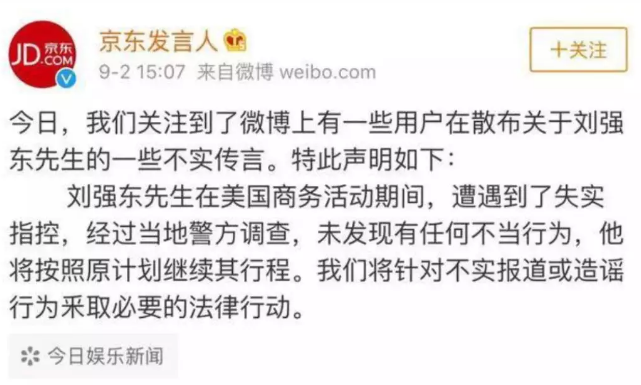 北京時間 9 月 2 日下午 3 點 07 分,京東發(fā)言人在微博上發(fā)聲明稱網(wǎng)上為 " 不實傳言 ",并表示 " 劉強東在美國商務(wù)活動期間,遭遇到了失實指控,經(jīng)過當(dāng)?shù)鼐秸{(diào)查,未發(fā)現(xiàn)有任何不當(dāng)行為,他將按照原計劃繼續(xù)其行程。我們將針對不實報道或造謠行為釆取必要的法律行動。"