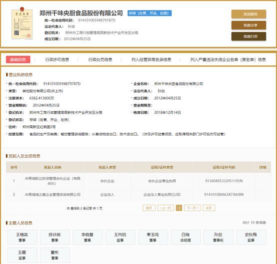 工商登記信息顯示,鄭州千味央廚食品股份有限公司于2012年4月25日注冊成立,注冊資本6382萬元,由共青城凱立投資管理合伙企業(yè)(有限合伙)和共青城城之集企業(yè)管理咨詢有限公司共同出資。