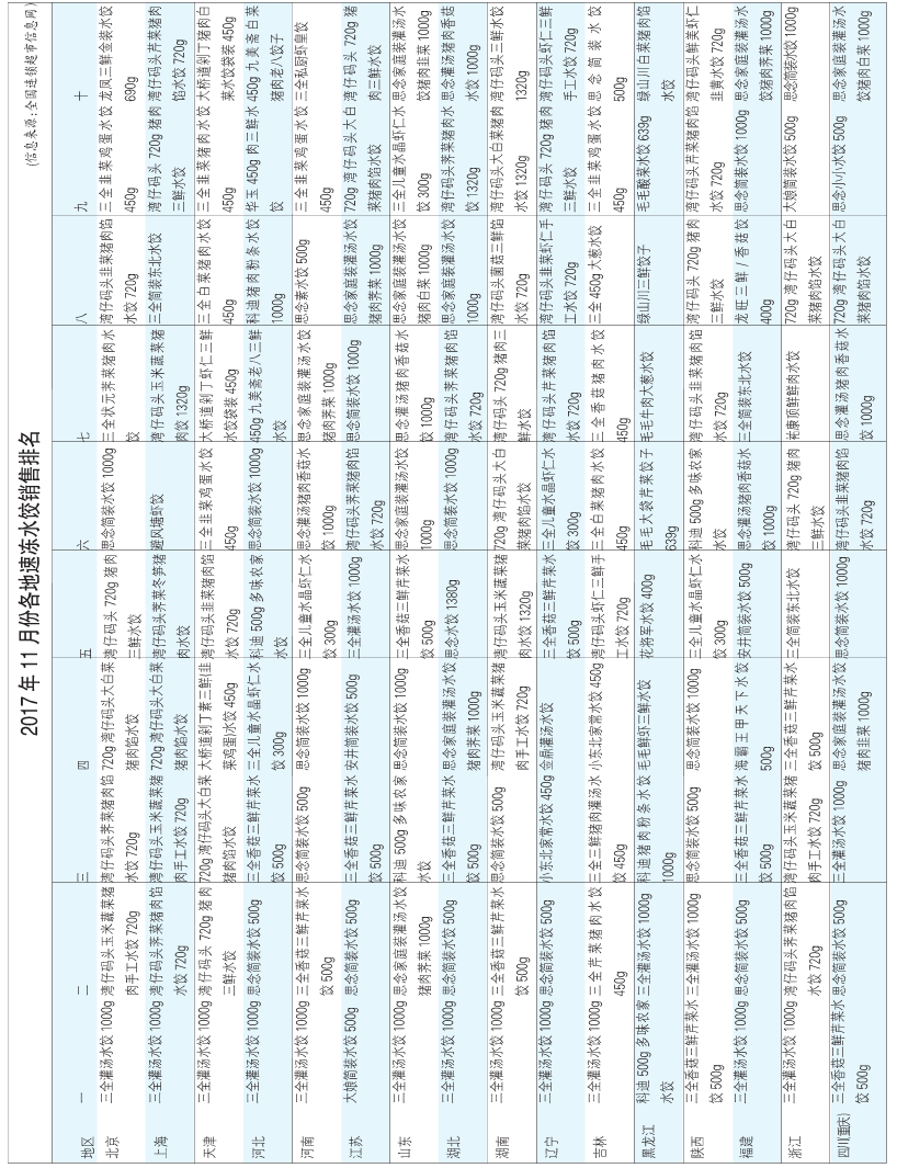 來(lái)源: 冷凍食品網(wǎng) 發(fā)布者:編輯▼2017年11月份各地速凍水餃銷售排名
