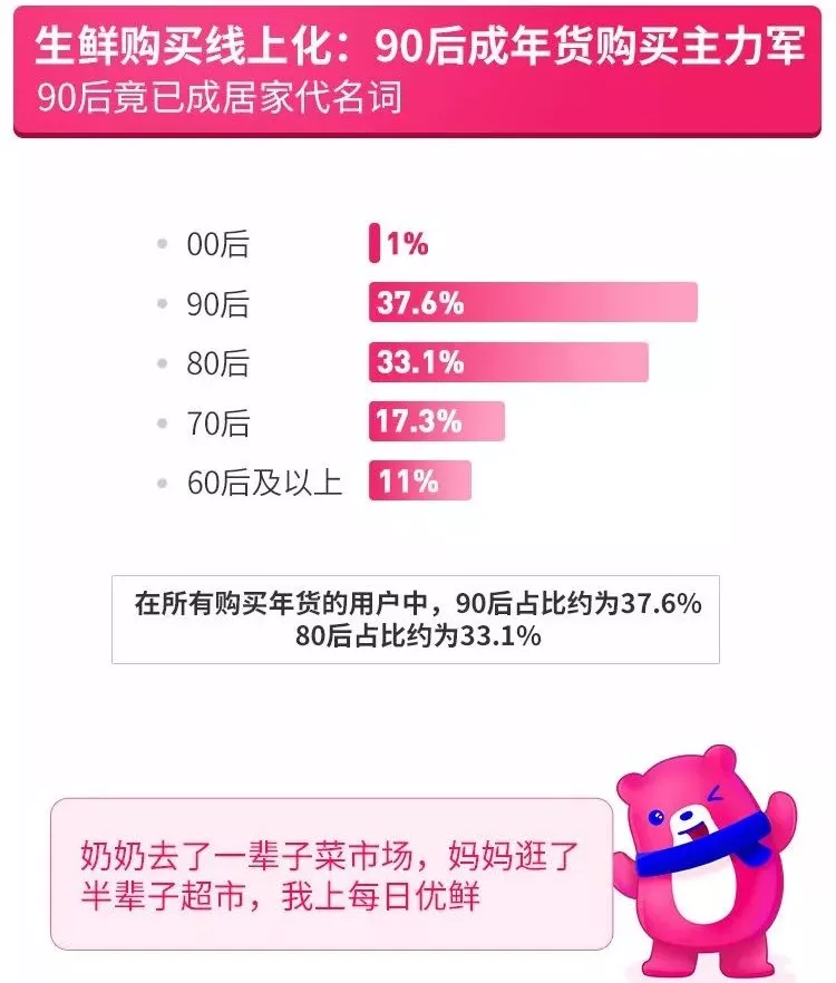 事實(shí)上,90后成為生鮮年貨消費(fèi)占比最高的群體并無意外。90后是與互聯(lián)網(wǎng)共同成長(zhǎng)的一代,對(duì)互聯(lián)網(wǎng)電商渠道有著天生的親近感。隨著90后步入婚姻生活,購(gòu)買生鮮成為剛需,他們不再如父輩選擇線下超市、菜市場(chǎng)作為生鮮年貨購(gòu)買地,而是選擇精選品類、即時(shí)送達(dá)的生鮮電商作為年貨購(gòu)買渠道。