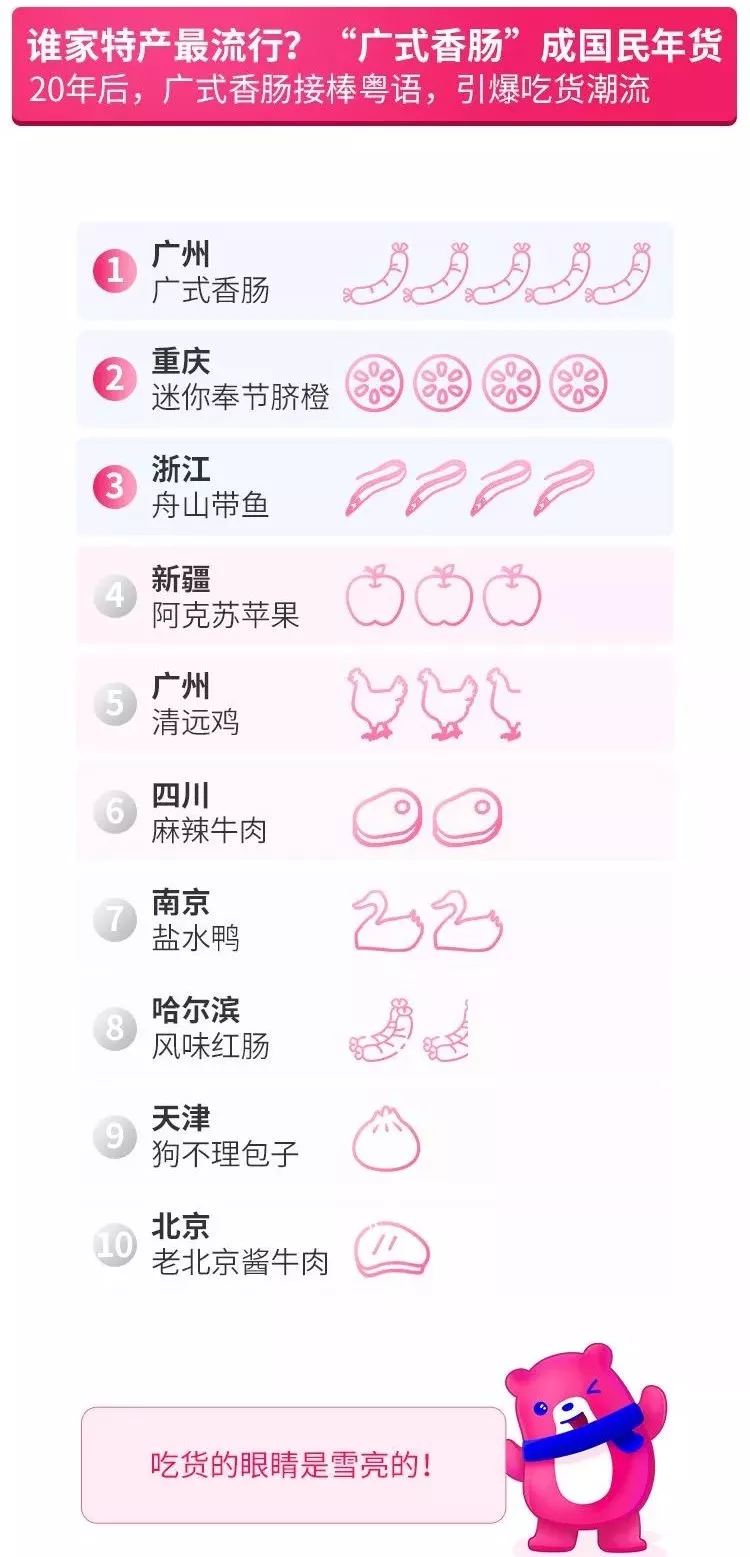 數(shù)據(jù)顯示,在所有地方的特產(chǎn)中,廣式香腸憑借銷量冠軍成為當(dāng)之無愧的“國(guó)民年貨”。此外,重慶奉節(jié)臍橙、浙江舟山帶魚、新疆阿克蘇蘋果、廣州清遠(yuǎn)雞緊跟其后。