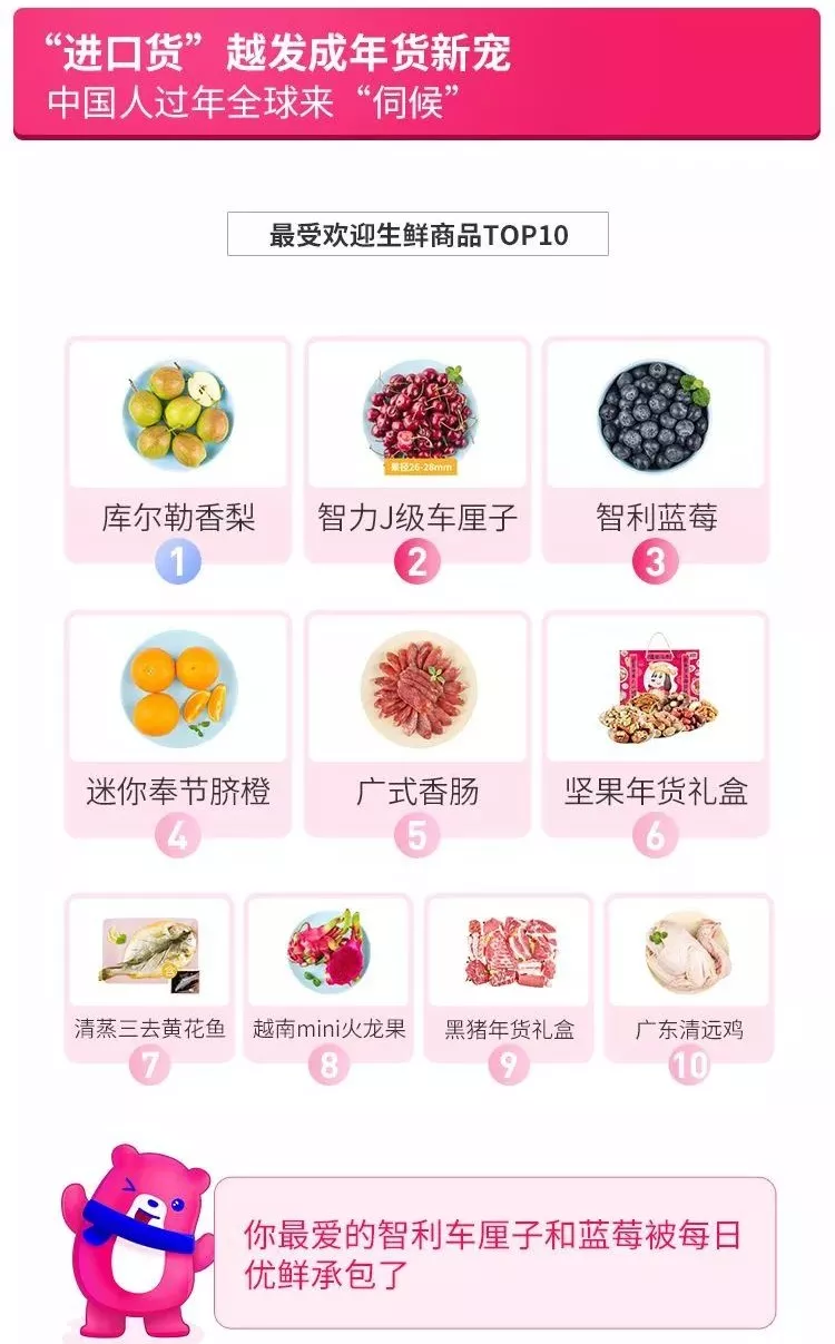 從整體生鮮品類來看,水果、肉類和乳品占據(jù)品類TOP榜前三位置。隨著國(guó)人飲食日益健康化,水果的受歡迎程度持續(xù)走高,占比約為25.7%。值得注意的是,在最受歡迎的十大生鮮年貨商品排行中,庫(kù)爾勒香梨、廣式香腸、黑豬年貨禮盒、智利車?yán)遄印⒅抢{(lán)莓、越南mini火龍果排名靠前,成為國(guó)人年貨新寵。