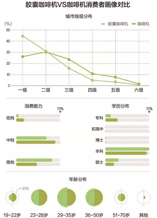 筆者對(duì)比了膠囊咖啡機(jī)與普通咖啡機(jī)的消費(fèi)者畫像發(fā)現(xiàn),購(gòu)買前者的人群明顯更精英、中產(chǎn)化。