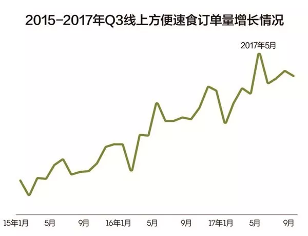 貝恩在《2017年中國(guó)購(gòu)物者報(bào)告》中提到,2013—2016年,用于家庭烹飪的食物消費(fèi)量每年增長(zhǎng)約3%,而相同時(shí)間內(nèi),外賣市場(chǎng)的年增速約為44%。從阿里數(shù)據(jù)(淘寶和天貓)來(lái)看,方便食品的線上銷量也在不斷增長(zhǎng)。