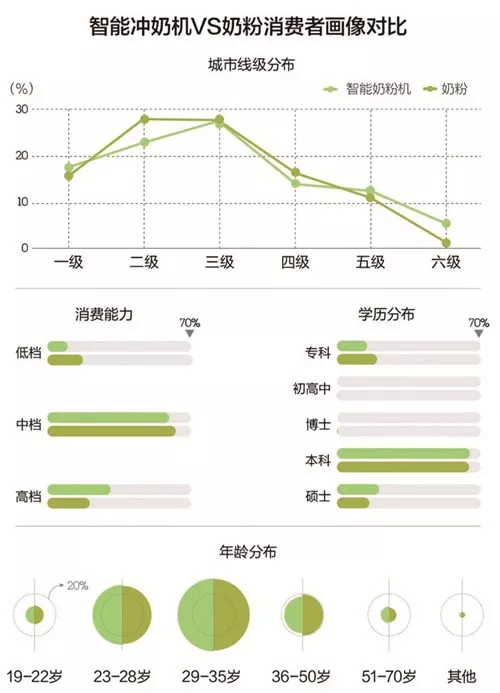 對(duì)比線上智能沖奶機(jī)和奶粉的消費(fèi)者畫像來(lái)看,前者的訂單中,來(lái)自一線城市、高學(xué)歷、中產(chǎn)、23~35歲的消費(fèi)者占比明顯較高。