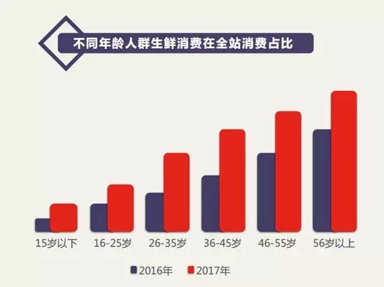 對比不同年齡段用戶在京東平臺的消費結(jié)構(gòu)發(fā)現(xiàn),50后、60后和70后用戶的生鮮消費在其京東全站消費占比最高,可見“銀發(fā)經(jīng)濟”效應在生鮮電商領(lǐng)域更為明顯,網(wǎng)上買菜、買肉的習慣也在逐步取代菜市場在中老年人心里的地位。