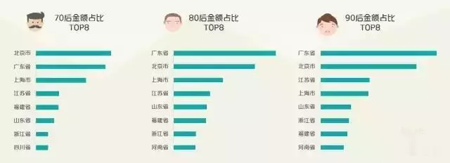 廣東、北京、上海消費(fèi)貢獻(xiàn)分列全國(guó)前三;北京70后的消費(fèi)貢獻(xiàn)為全國(guó)同齡消費(fèi)規(guī)模冠軍;廣東80、90后位列全國(guó)同齡規(guī)模冠軍。