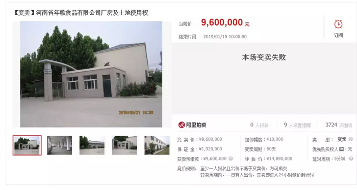 據(jù)了解, 2018年8月份,年歌食品工廠首次在阿里巴巴上公開拍賣,1191萬元流拍;10月12日,二次公開拍賣,960萬元,再次流拍;前天的流拍已經(jīng)是第三次,年歌食品已進(jìn)入變賣程序。