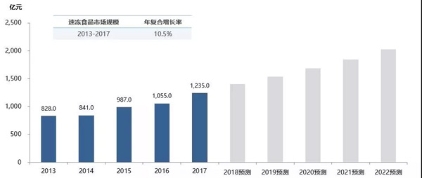 來(lái)源: 冷凍食品網(wǎng) 發(fā)布者:編輯近日,全球最大的企業(yè)增長(zhǎng)咨詢公司弗瑞斯特沙利文(Frost & Sullivan)發(fā)布了《中國(guó)速凍食品行業(yè)概覽》(以下簡(jiǎn)稱“報(bào)告”)。報(bào)告顯示,中國(guó)速凍食品市場(chǎng)規(guī)模從2013年的828.0億元上升至2017年的1235.0億元,年復(fù)合增長(zhǎng)率10.5%。