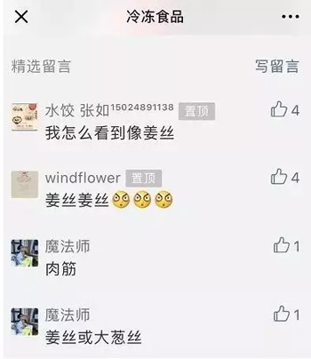 冷食傳媒記者發(fā)現(xiàn)后臺(tái)的評(píng)論很有意思。多位用戶留言表示,水餃中的“麻繩”可能是姜絲、蔥絲或者肉筋。