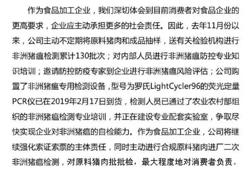 來(lái)源: 冷凍食品網(wǎng) 發(fā)布者:編輯昨天(20日)下午,三全食品通過(guò)新浪微博發(fā)布聲明稱(chēng),作為食品加工企業(yè),公司會(huì)主動(dòng)承擔(dān)更多的社會(huì)責(zé)任,主動(dòng)進(jìn)行合規(guī)原料豬肉進(jìn)廠二次非洲豬瘟檢測(cè),將對(duì)原料豬肉“批批檢”,最大程度地對(duì)消費(fèi)者負(fù)責(zé)。