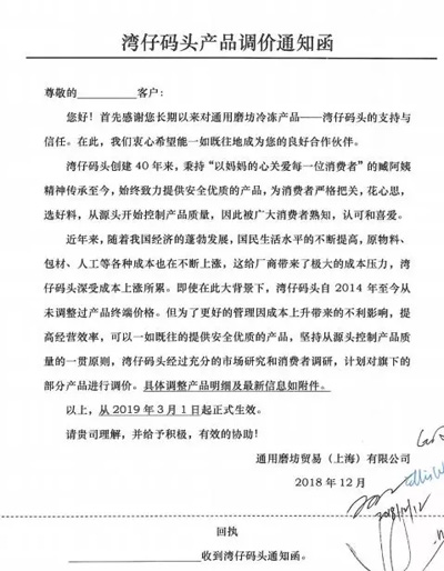 近日,冷食傳媒記者獲悉,通用磨坊貿(mào)易(上海)有限公司對(duì)經(jīng)銷商發(fā)出“灣仔碼頭產(chǎn)品調(diào)價(jià)通知函”。