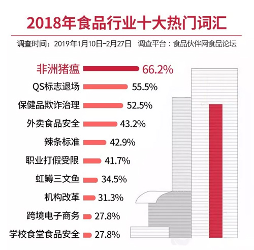 按照以往的慣例,本次活動(dòng)首先由食品論壇的熱心網(wǎng)友針對2018年熱門事件概括成一個(gè)關(guān)鍵詞提交,后經(jīng)過整理篩選出20個(gè)候選詞匯,并于2019年1月10日-2月27日在食品論壇投票。期間共有708位經(jīng)過審核認(rèn)證的注冊網(wǎng)友參與投票,最終選出“非洲豬瘟”、“QS標(biāo)志退場”、“保健品欺詐治理”等十大熱門詞匯。