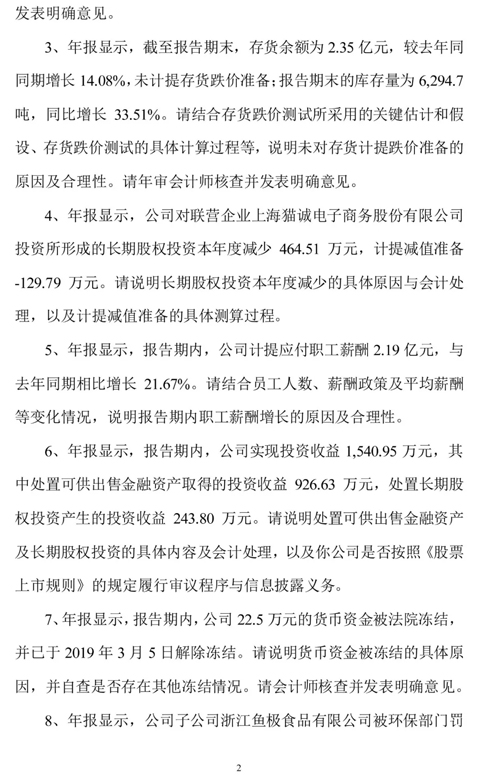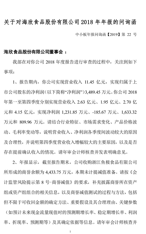 來(lái)源: 冷凍食品網(wǎng) 發(fā)布者:編輯3月25日,海欣食品收到年報(bào)問(wèn)詢函,深交所要求公司結(jié)合行業(yè)特征、市場(chǎng)需求變化、產(chǎn)品價(jià)格波動(dòng)、毛利率變動(dòng)等,說(shuō)明營(yíng)業(yè)收入、凈利潤(rùn)各季度間波動(dòng)較大的原因及合理性,并說(shuō)明第四季度營(yíng)業(yè)收入增幅較大的主要原因,以及是否存在提前確認(rèn)收入的情況。