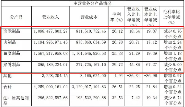 值得注意的是,菜肴制品2018年營收3.95億元,占總營收的9.28%。雖然這個比重不算太大,但菜肴制品的營收比上年增長45.86%,毛利率更是高達29.72%,發(fā)展速度非常驚人。