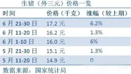 偏緊的供應(yīng)量影響了價(jià)格,國家統(tǒng)計(jì)局?jǐn)?shù)據(jù)顯示,6月21-30日,生豬價(jià)格(外三元)達(dá)到了17.2元/千克,連續(xù)上漲了四期。