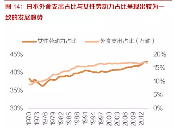 隨著生活節(jié)奏的加快,家務勞動社會化趨勢更加明顯。對比日本,可以發(fā)現(xiàn)家務勞動的社會化進程中,外食和速凍食品的消化量也在逐年提高。因此可以看出家務勞動的社會化進程,是外食和速凍食品等便捷式餐飲形式發(fā)展的主要動力。