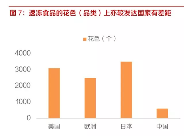 速凍食品的花色(品類)上,美、歐、日均保持在2500種以上,而我國僅600 種,較發(fā)達國家亦有差距。