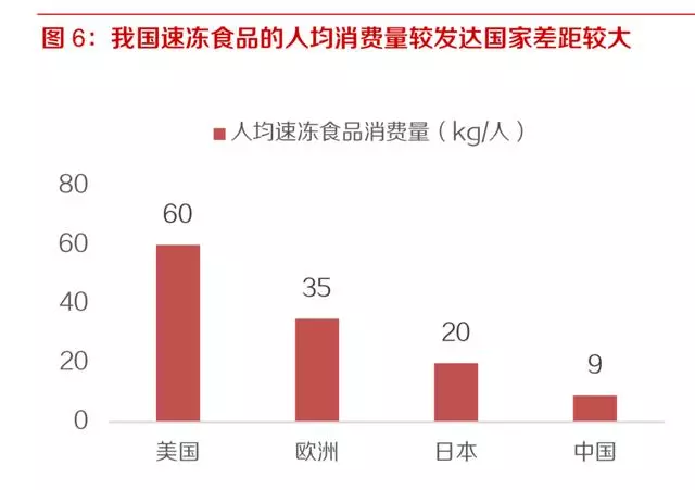 人均消費量上,美國速凍食品人均消費量達到60kg/年,歐洲35kg/年,日本也達 到了 20kg/年,但相比之下我國的人均消費量僅為9kg/年,較發(fā)達國家的差距較大;