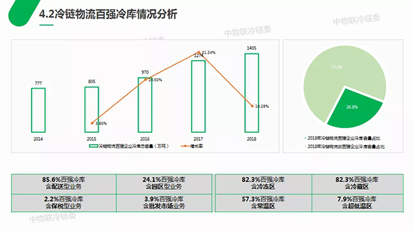 冷鏈物流百強企業(yè)冷庫資源方面顯示,2018年投入使用的冷庫共約1405萬噸(折合3513萬立方米),較去年百強增長10.28%。百強企業(yè)冷庫總量約可占到總?cè)萘康?6.8%,與往年百強冷庫容量占比基本持平。截至2018年年底,我國冷庫總量達到5238萬噸(折合1.3億立方米)。