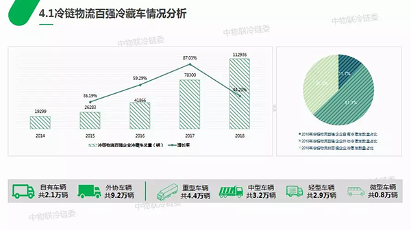 冷鏈物流百強企業(yè)冷藏車資源方面顯示,近5年來百強自有和可控制的冷藏車總量逐年攀升。2018年百強投入使用的冷藏車共計112936輛,較去年增長44.23%,占到全國冷藏車保有量的62.8%,占比較去年的56%有所增長;百強自有車輛共計2.1萬輛,占到全國冷藏車保有量的11.7%,截至2018年年底,我國冷藏車保有量為18萬輛。同時百強冷鏈運輸平均月公里數(shù)為8438公里/車,與普貨運輸相比冷鏈物流運行效率還有很大的提升空間。