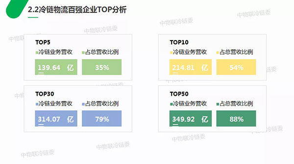 2018年,冷鏈物流企業(yè)前5名的營收達到139.64億元,占到百強總營收的35%;冷鏈物流企業(yè)前10名的營收達到214.81億元,占到百強總營收的54%,頭部集聚效應(yīng)明顯;冷鏈物流企業(yè)前30名的營收達到314.07億元,占到百強總營收的79%;冷鏈物流企業(yè)前50名的營收達到349.92億元,占到百強總營收的88%。冷鏈物流企業(yè)后50名的營收只占到百強總營收的12%,意味著中小企業(yè)占據(jù)多數(shù),冷鏈物流行業(yè)仍面臨散、小、雜的特點。