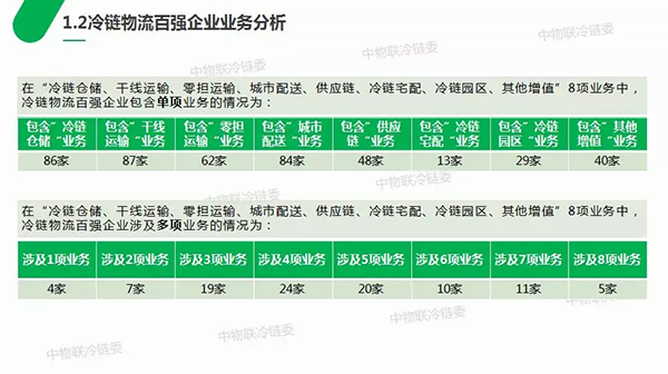 2018年冷鏈物流百強企業(yè)中業(yè)務(wù)著重布局的前三名分別是:干線運輸、冷鏈倉儲、城市配送,開展冷鏈宅配、冷鏈園區(qū)業(yè)務(wù)的百強企業(yè)較少。同時,可以看出當前單一業(yè)務(wù)類型的冷鏈物流企業(yè)數(shù)量極少,大部分冷鏈物流企業(yè)涉及3-5項業(yè)務(wù),涉及業(yè)務(wù)類型多元,紛紛向綜合冷鏈物流服務(wù)企業(yè)轉(zhuǎn)型,未來冷鏈物流發(fā)展將向供應(yīng)鏈方向邁進。