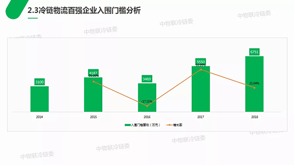 2018年冷鏈物流百強企業(yè)入圍門檻營收為6751萬;2017年冷鏈物流百強企業(yè)入圍門檻營收為5550萬;2016年冷鏈物流百強企業(yè)入圍門檻營為收3469萬;2015年冷鏈物流百強企業(yè)入圍門檻營為收4187萬;2014年冷鏈物流百強企業(yè)入圍門檻營收為3100萬。