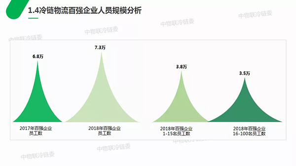 整體來說,冷鏈物流百強企業(yè)人員規(guī)模較小,2018年在吸納社會就業(yè)方面保持了平穩(wěn)速度的增長,提供就業(yè)崗位數(shù)量約7.3萬個,同比增長7.35%,人員規(guī)模集中在頭部,百強企業(yè)前15名的員工人數(shù)達3.8萬人,占到百強企業(yè)員工總?cè)藬?shù)的52.05%,而百強企業(yè)16-100名的員工人數(shù)為3.5萬人。