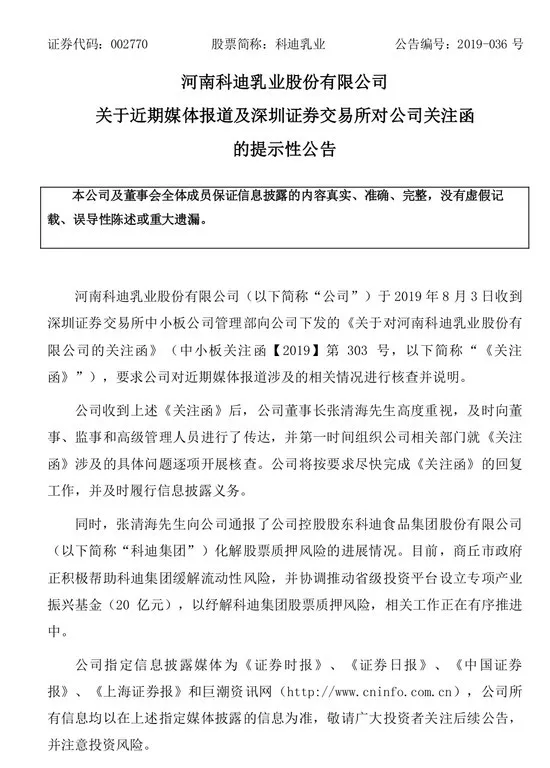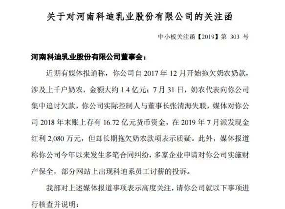 8月3日,在風(fēng)口浪尖上的科迪乳業(yè)收到深圳證券交易所中小板關(guān)注函,要求其就媒體報(bào)道的科迪乳業(yè)拖欠奶農(nóng)奶款、公司貨幣資金、合同糾紛等問題進(jìn)行說明,并要求2019年8月9日前回復(fù)。