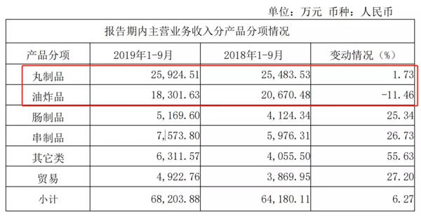 丸制品和油炸品,一直是惠發(fā)食品最大的兩個(gè)產(chǎn)品品類,但前三季度,它們的增幅極低,分別為1.73%和-11.46%。油炸品還出現(xiàn)了負(fù)增長(zhǎng)。